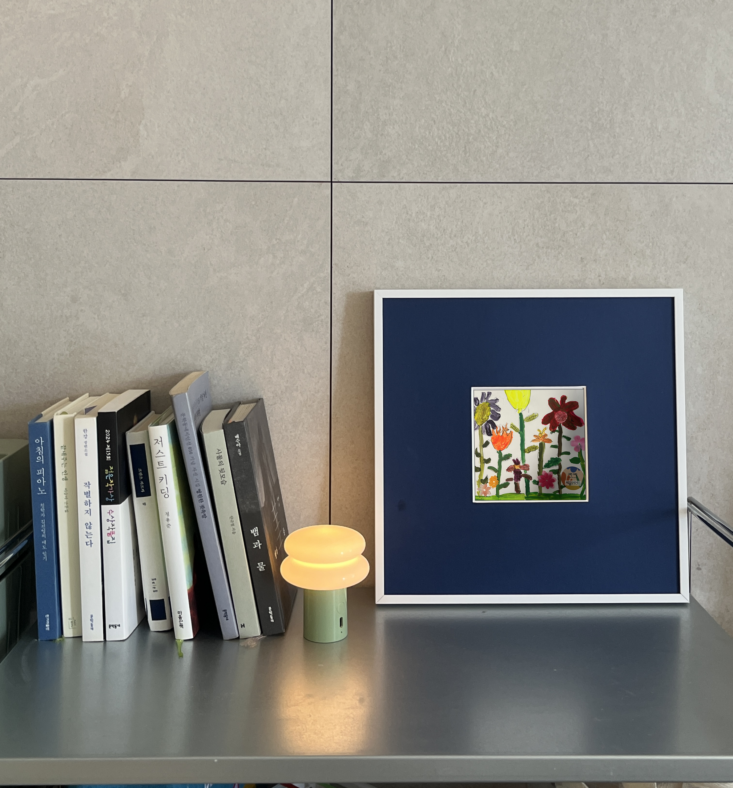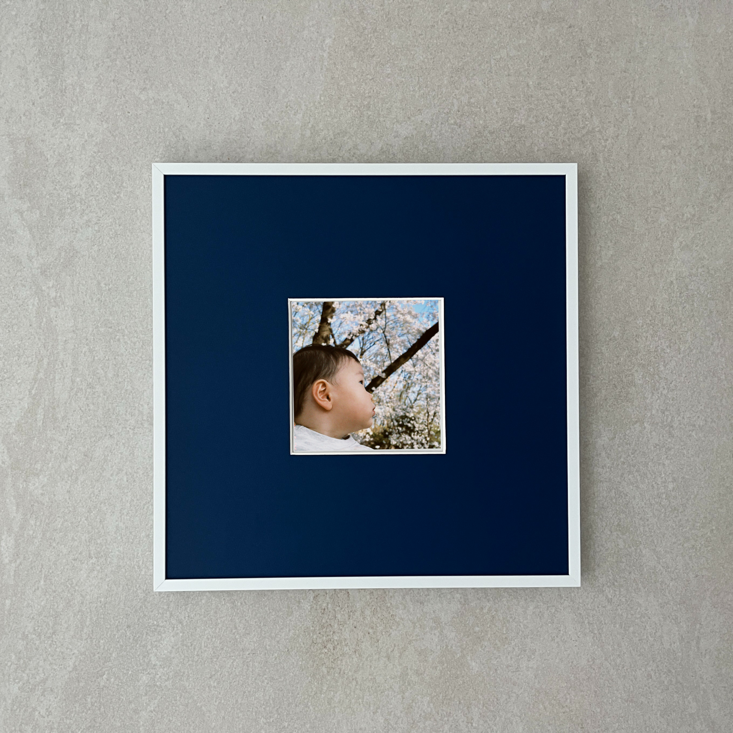 넓은 여백과 짙은 블루 컬러 마운트가 중심 이미지를 또렷하게 부각시키며,