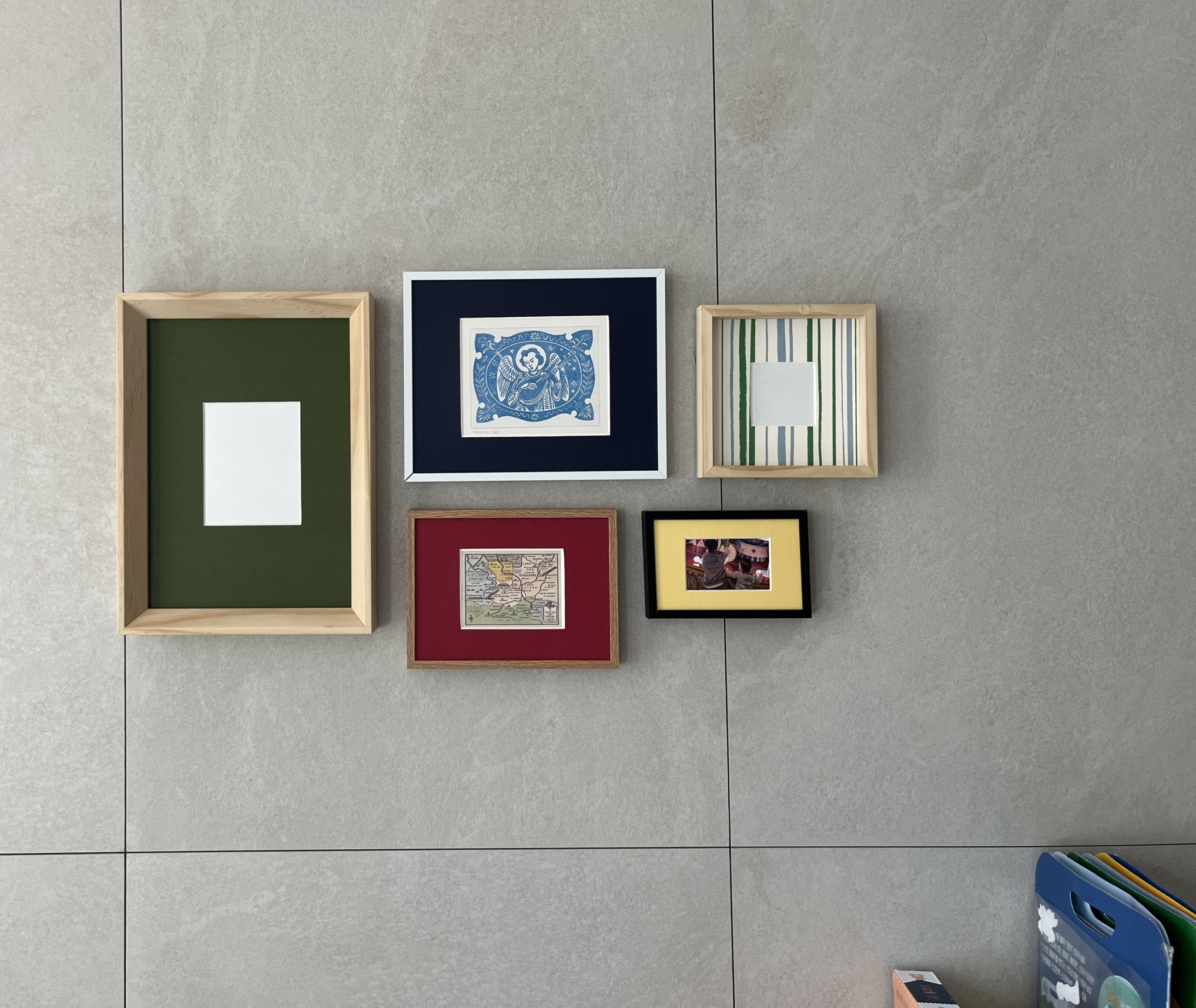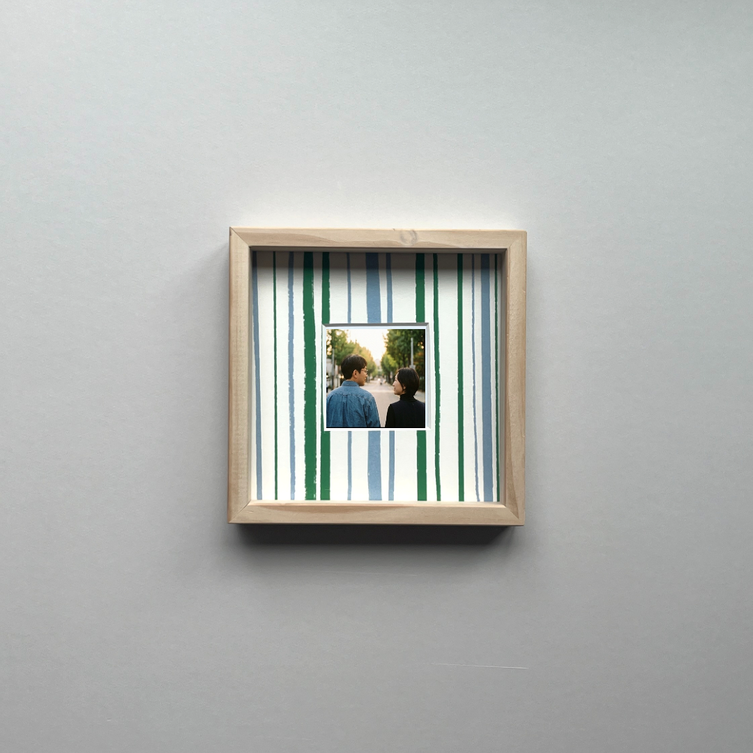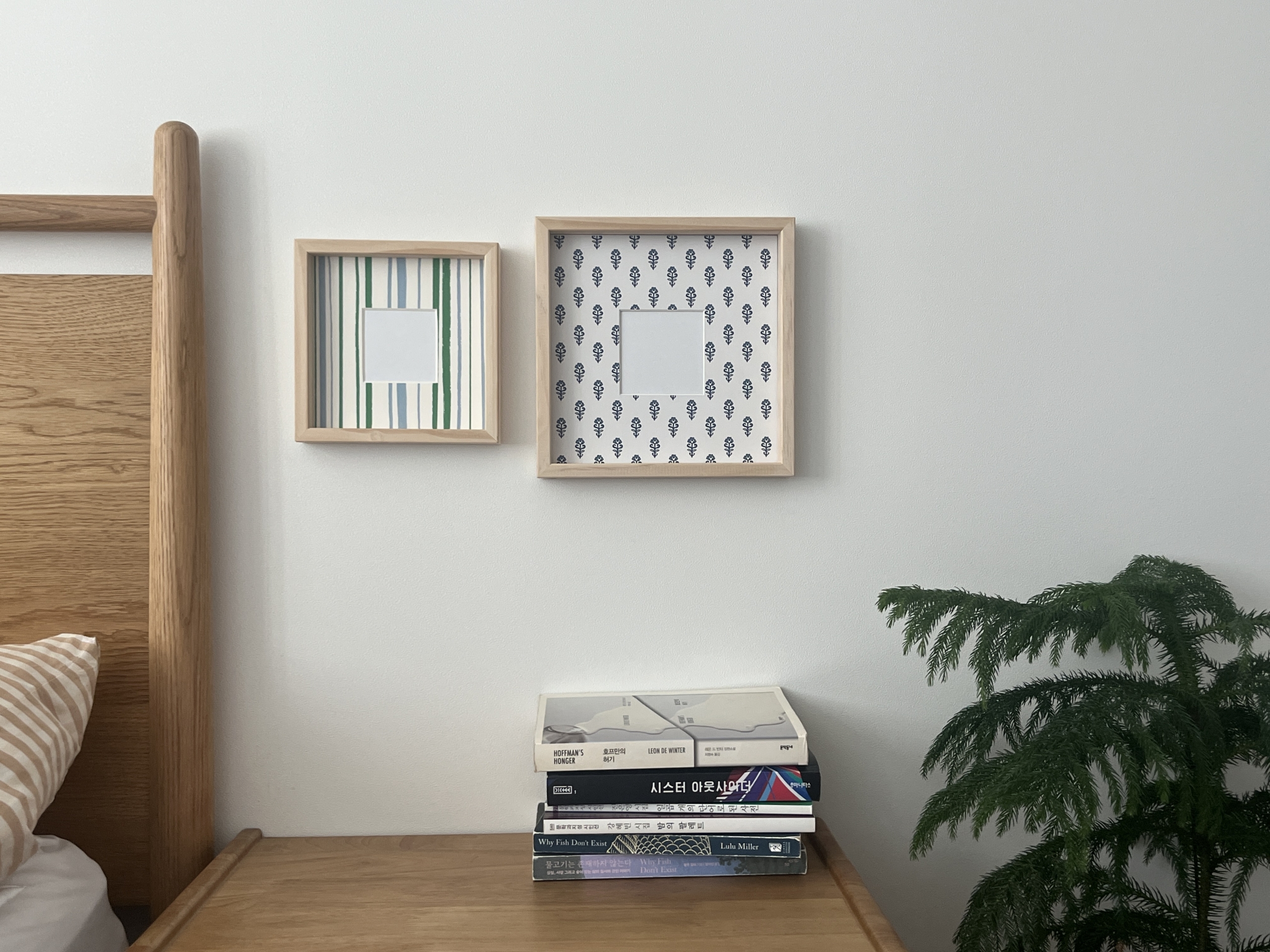 내추럴한 원목 프레임에 블루와 그린 스트라이프 패턴 마운트를 더해